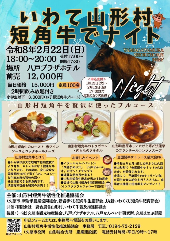 いわて山形村短角牛を食べて、知って、ファンになっていただくことを目的に、「いわて山形村短角牛でナイトin八戸」が今年も八戸プラザホテルで開催されます。